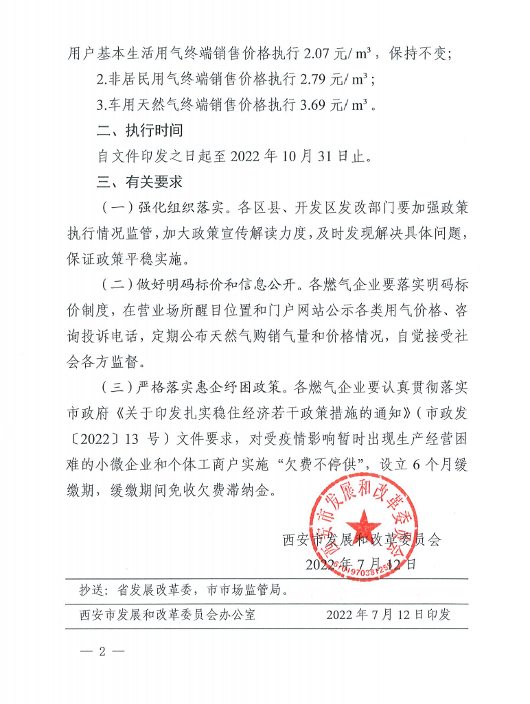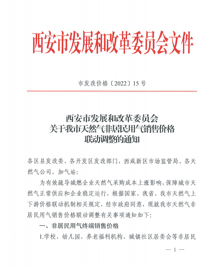根據(jù)西安市發(fā)展和改革委員會《關(guān)于我市天然氣非居民用氣銷售價格聯(lián)動調(diào)整的通知(市發(fā)改價格〔2022〕15號)》文件規(guī)定,自2022年7月12日起,非居民用氣及車用天然氣終端銷售價格調(diào)整如下: