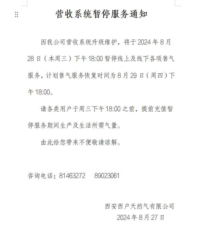 西安西戶天然氣營收系統(tǒng)暫停服務(wù)通知